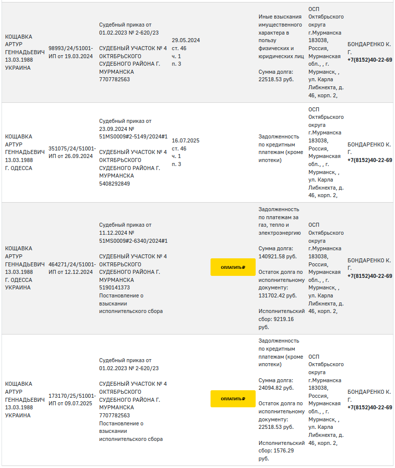 - Многочисленные задолженности по кредитам и коммунальным платежам на сайте судебных приставов:
